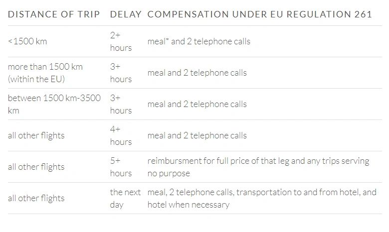 For flights to, from, or within the European Union, EU Flight Compensation Regulation 261 guarantees a right to compensation based off of the length of the flight and the length of the delay. Please see the below table for reference. If, however, your flight was operated by a non-EU carrier and arriving from outside the EU, Regulation 261 does not apply. The delay must be caused by the airline, i.e. staffing problems, mechanical problems, or under-booking.
